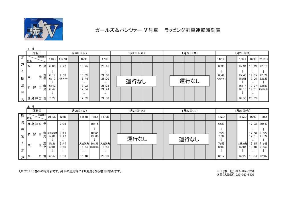 1/20(火)~1/23(金) 『ガールズ&パンツァー』 ラッピング列車(Ⅴ号車)運行時刻のお知らせ