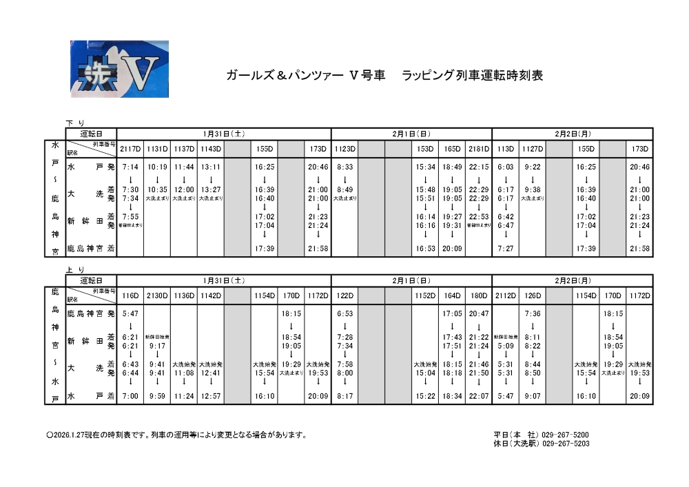 1/31(土)~2/2(月) 『ガールズ&パンツァー』 ラッピング列車(Ⅴ号車)運行時刻のお知らせ