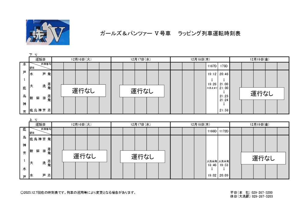 12/16(火)~12/19(金) 『ガールズ&パンツァー』 ラッピング列車(Ⅴ号車)運行時刻のお知らせ