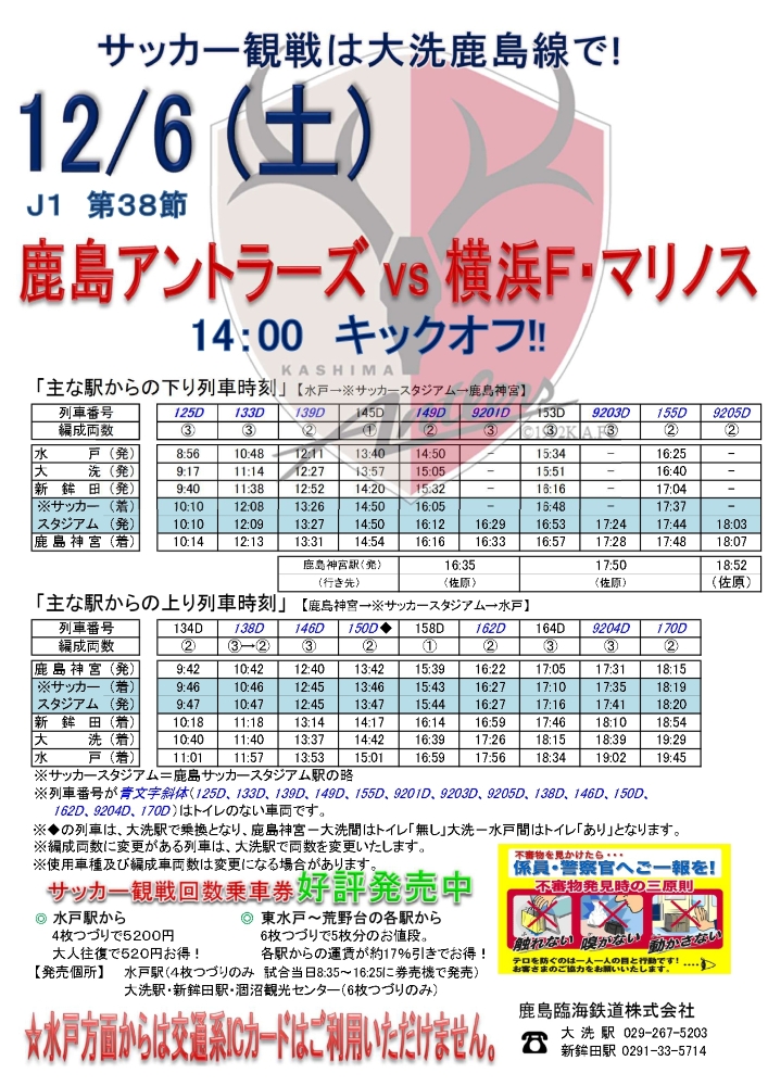 12/6(土曜日)は、J1第38節『鹿島アントラーズvs横浜F・マリノス』戦が開催されるため、鹿島サッカースタジアム駅に臨時停車いたします。