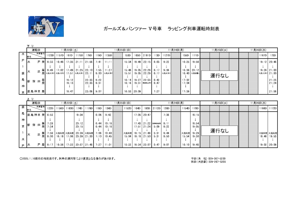 11/22(土)~11/26(水) 『ガールズ&パンツァー』 ラッピング列車(Ⅴ号車)運行時刻のお知らせ