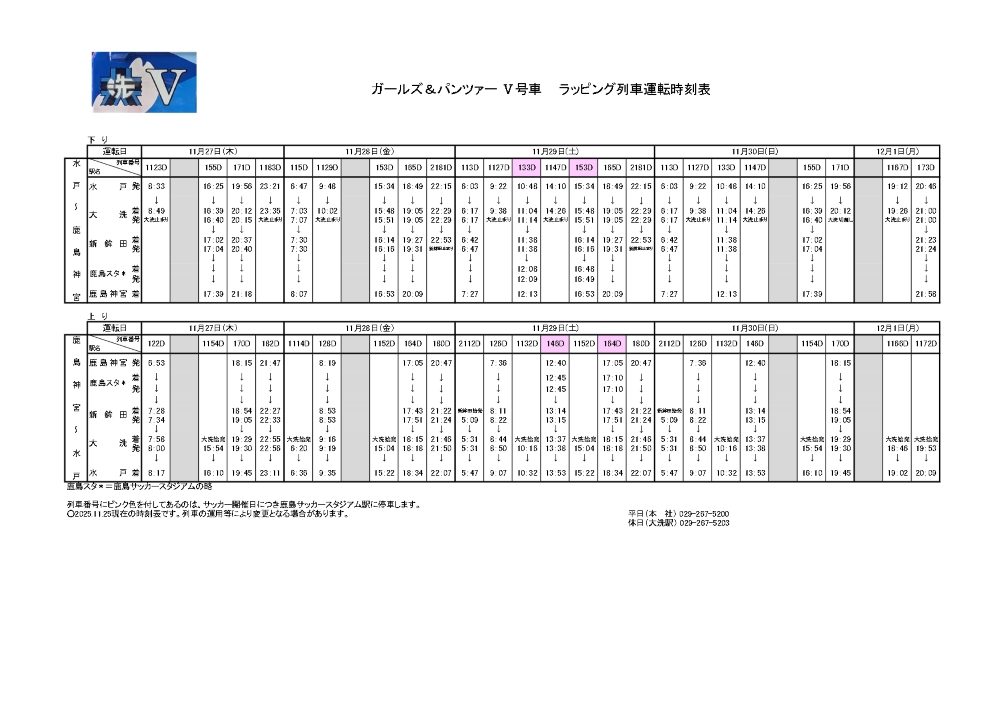 11/27(木)~12/1(月) 『ガールズ&パンツァー』 ラッピング列車(Ⅴ号車)運行時刻のお知らせ