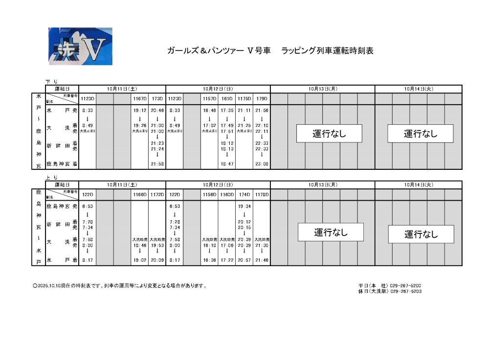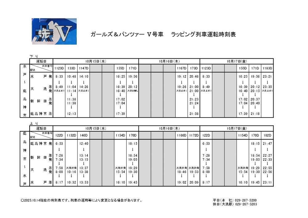 10/15(水)~10/17(金) 『ガールズ&パンツァー』 ラッピング列車運行時刻のお知らせ
