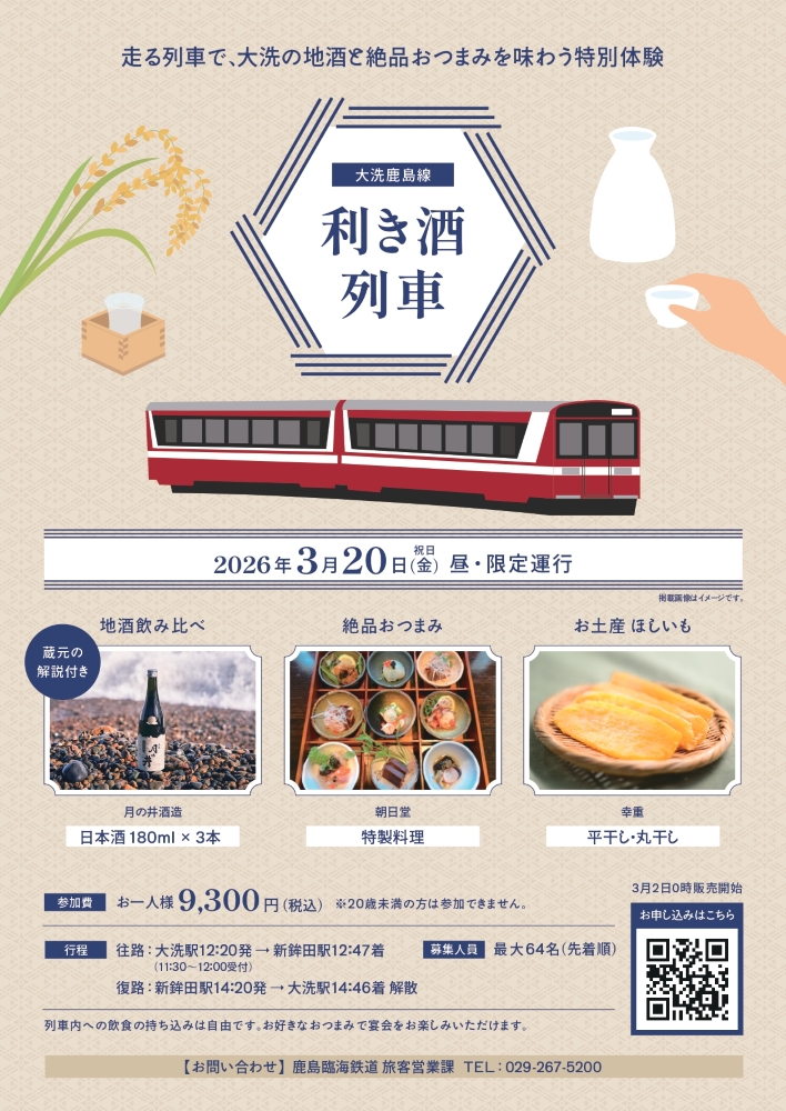 3月20日、大洗鹿島線では大洗のお酒と絶品おつまみを味わう列車を運行します。