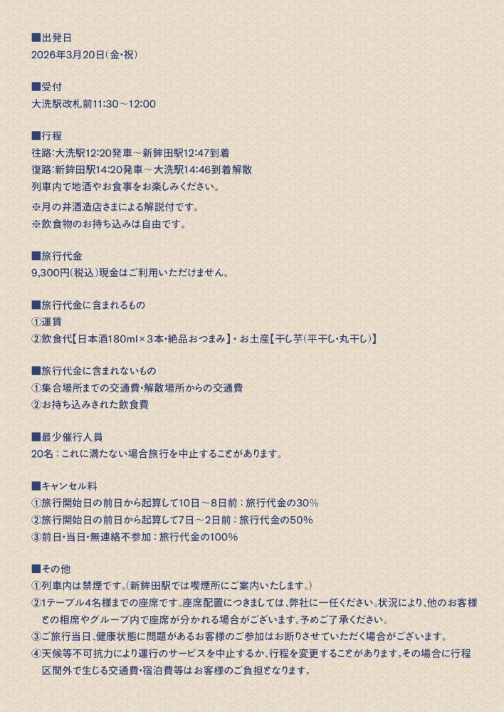 ◆出発日 2026年3月20日(金・祝) ※大洗駅改札前11:30~12:00で受付を行います。