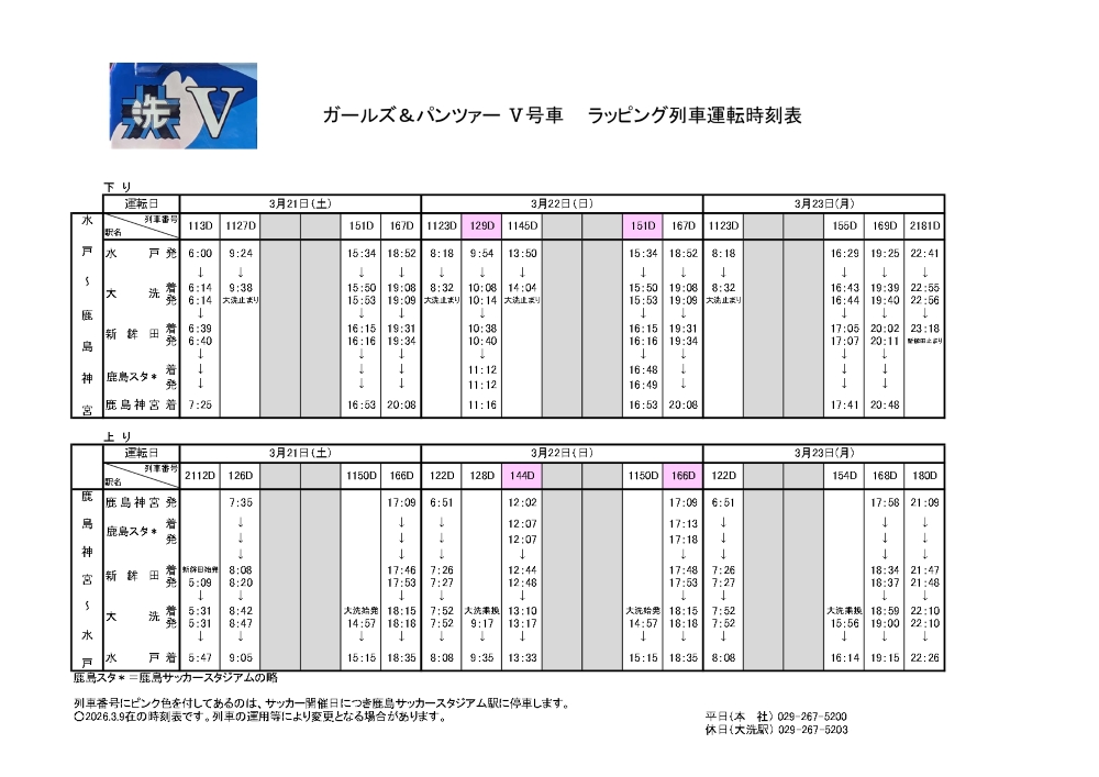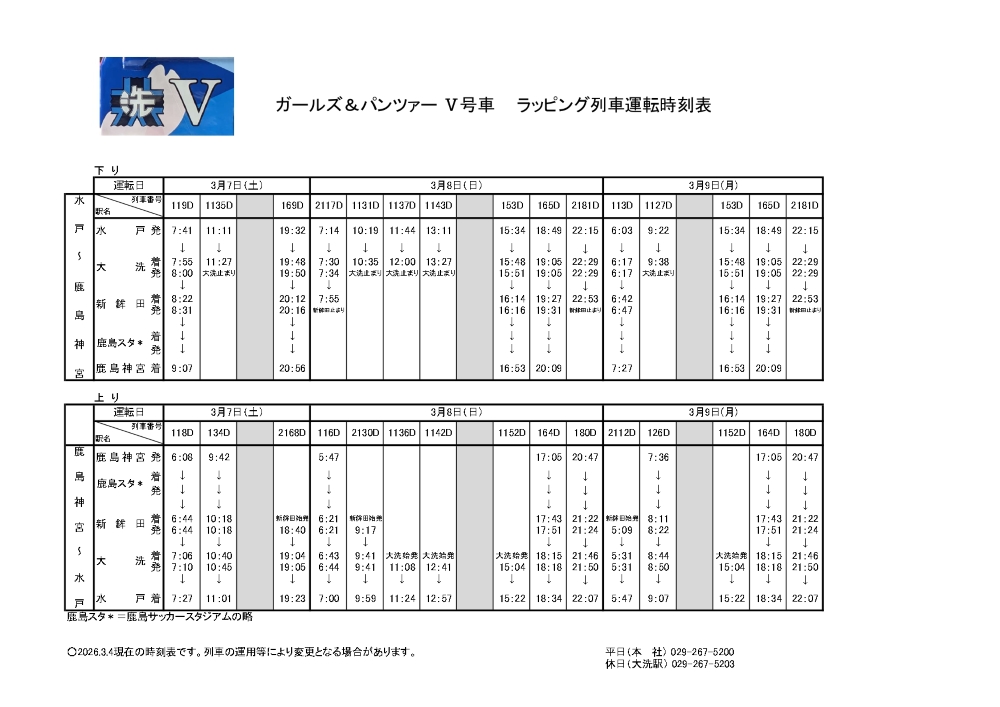 3/21(土)~3/23(月) 『ガールズ&パンツァー』 ラッピング列車(Ⅴ号車)運行時刻のお知らせ